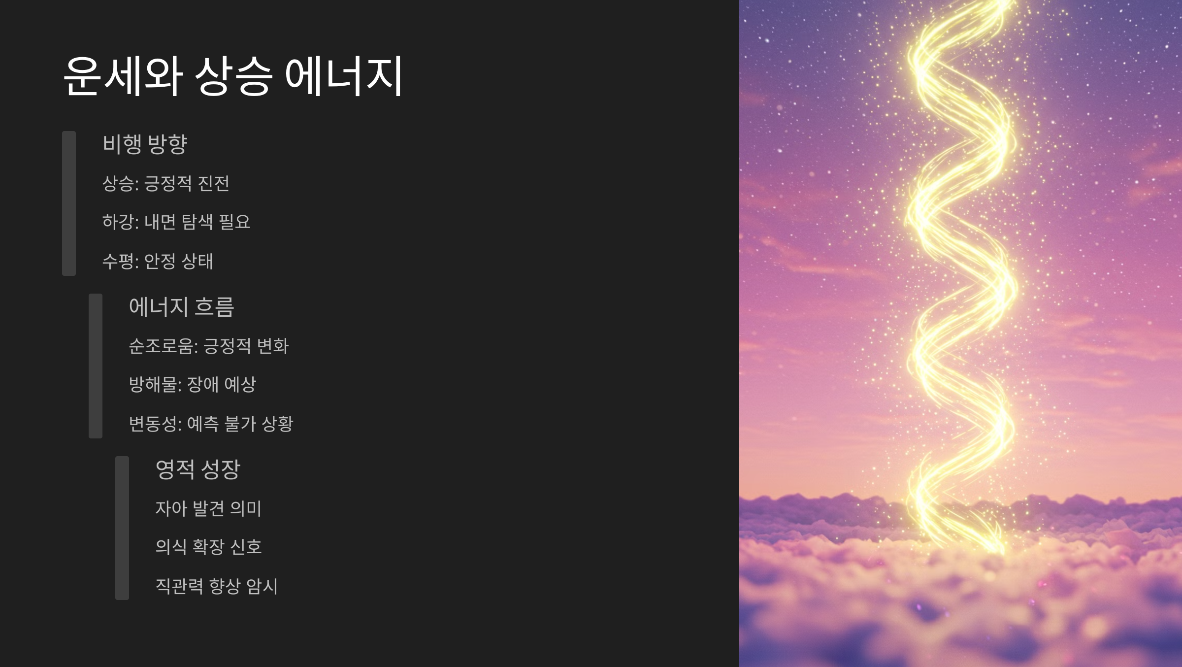 비상하는 꿈은 자아 확장의 상징이에요. 높이 올라갈수록, 내 꿈도 커지고 있다는 걸 보여줘요. ☁️
