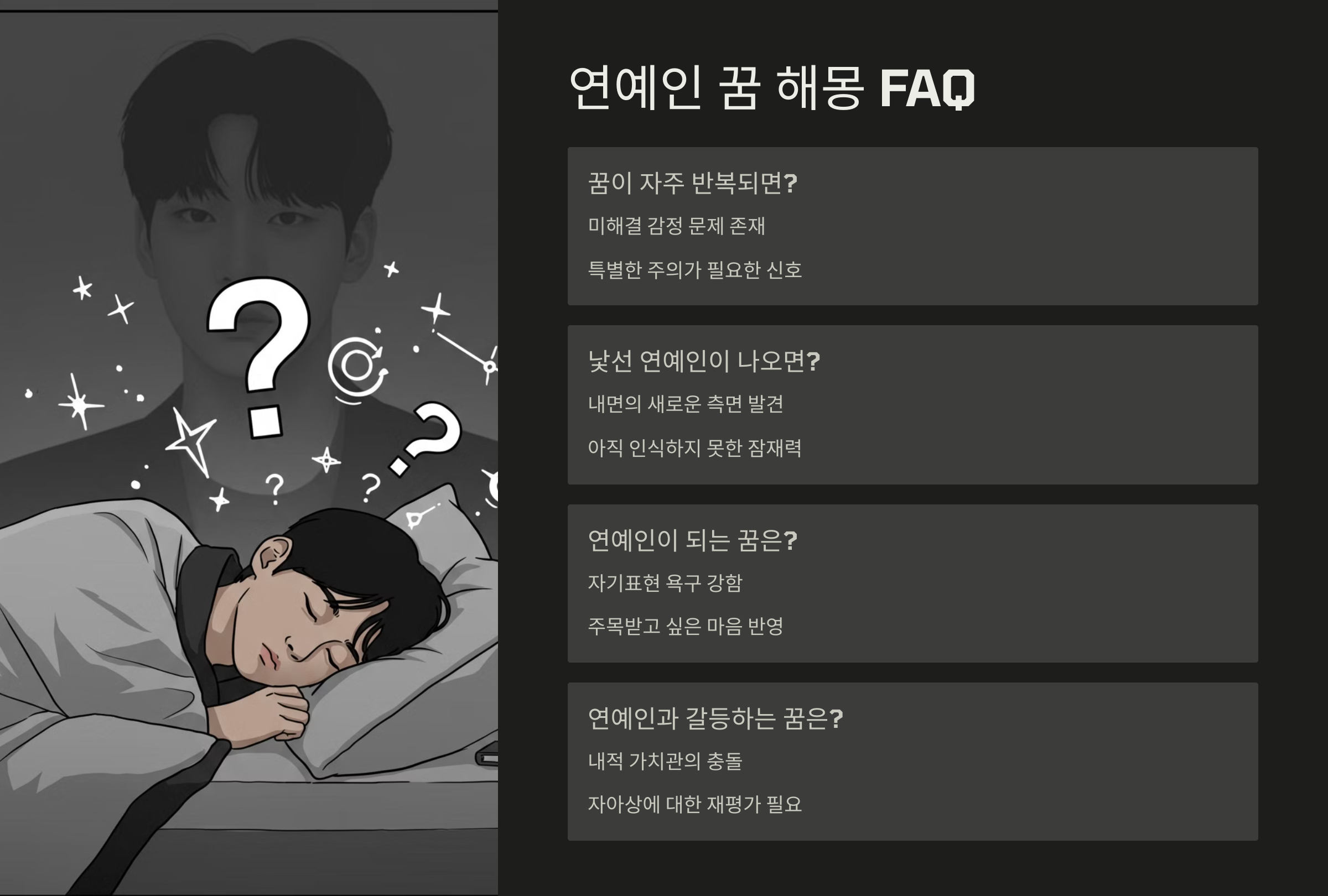 내가 생각했을 때 연예인 나오는 꿈은, 지금 내가 현실보다 더 빛나는 ‘무언가’를 갈망하고 있다는 무의식의 손짓 같아요. 인정받고 싶고, 변화하고 싶은 마음이 꿈의 스크린에 비춰지는 거죠.