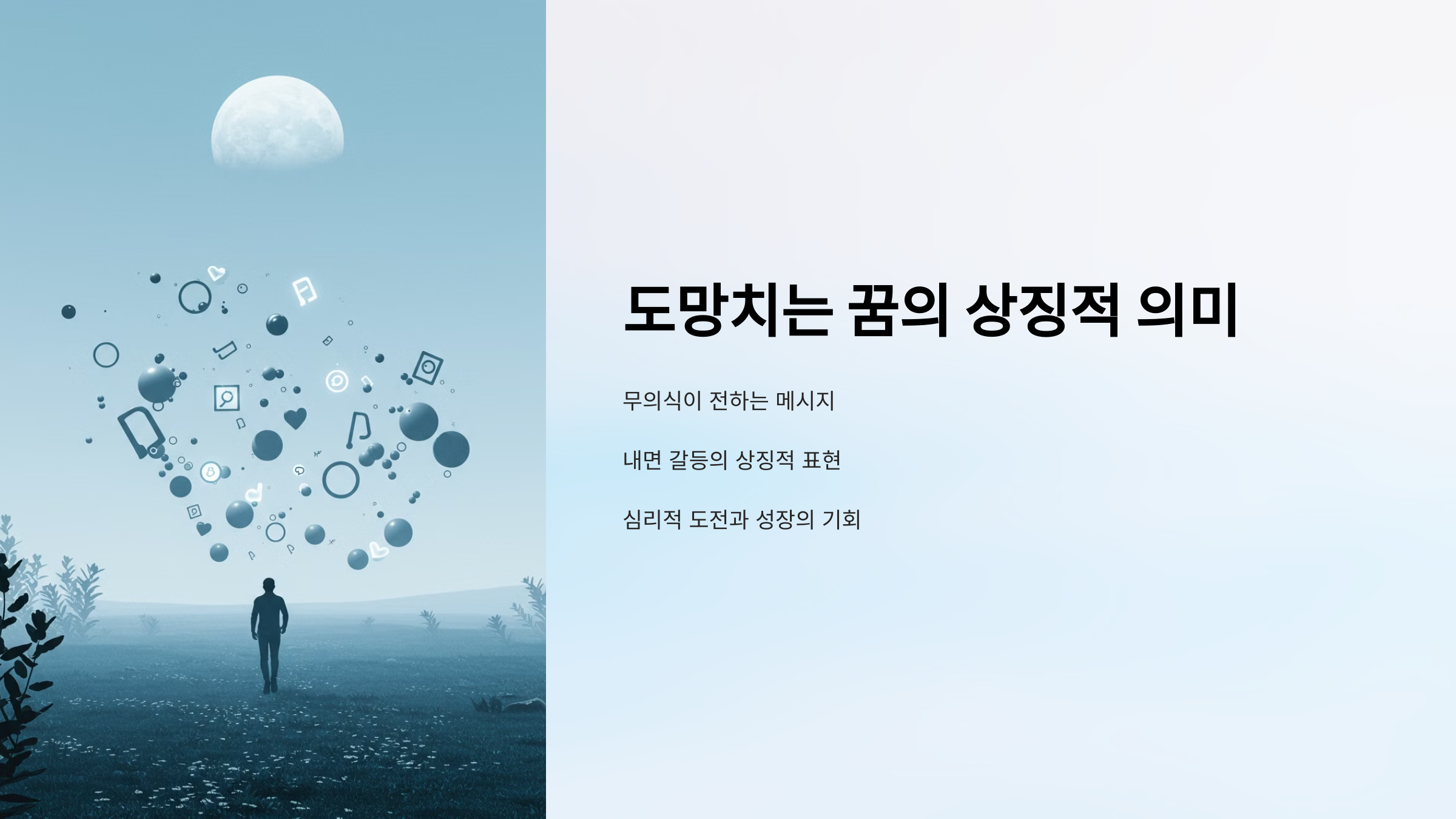 도망치는 꿈은 결국 내 마음을 마주하게 하는 장면이에요. 내가 피하고 있는 것이 무엇인지, 왜 그걸 감추고 있는지를 알아차리는 게 이 꿈의 핵심이에요. 이는 자기 인식의 시작이에요.
