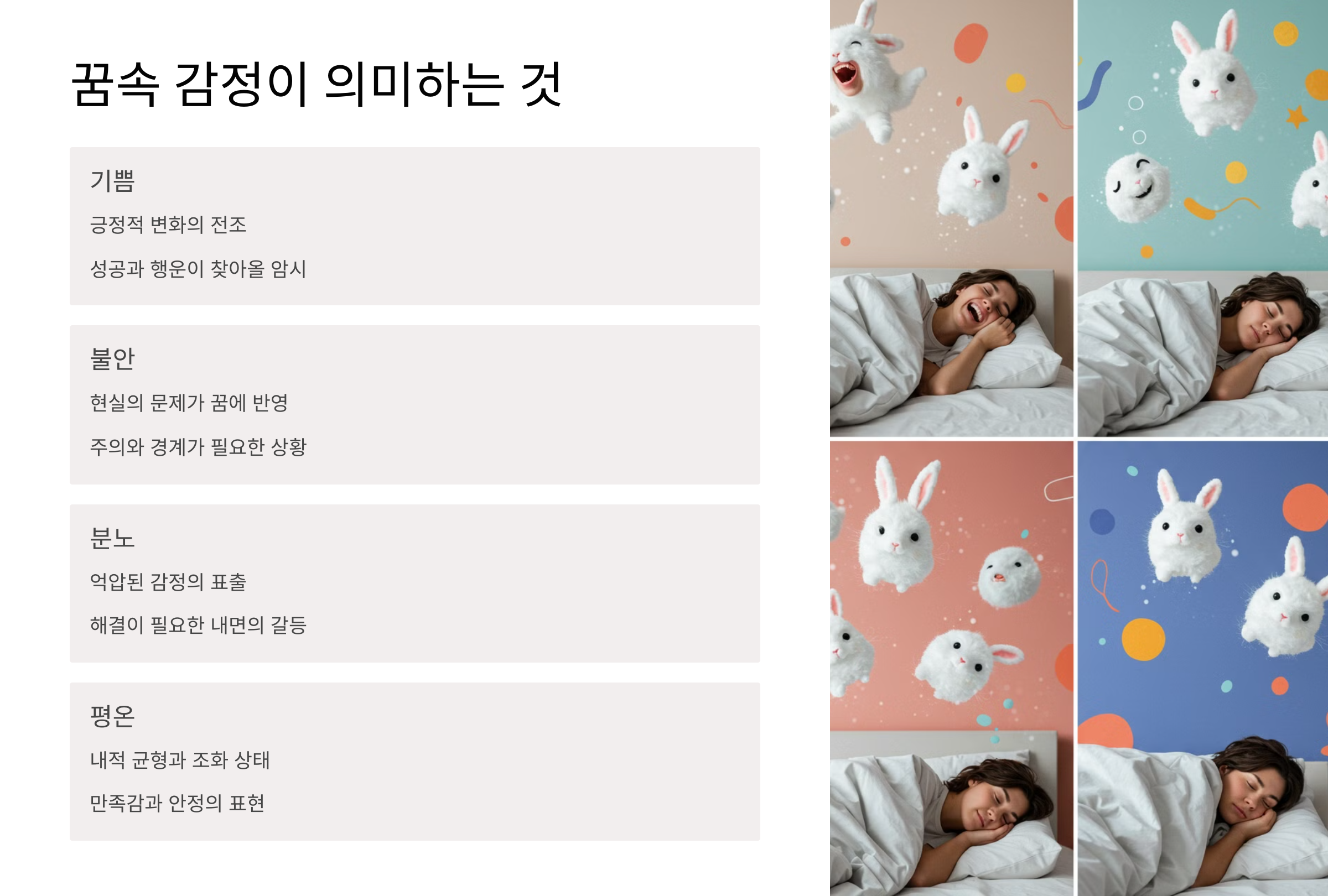 감정은 꿈의 방향을 결정하는 핵심이에요. 토끼 꿈에서 어떤 감정을 느꼈는지 꼭 되새겨보세요.