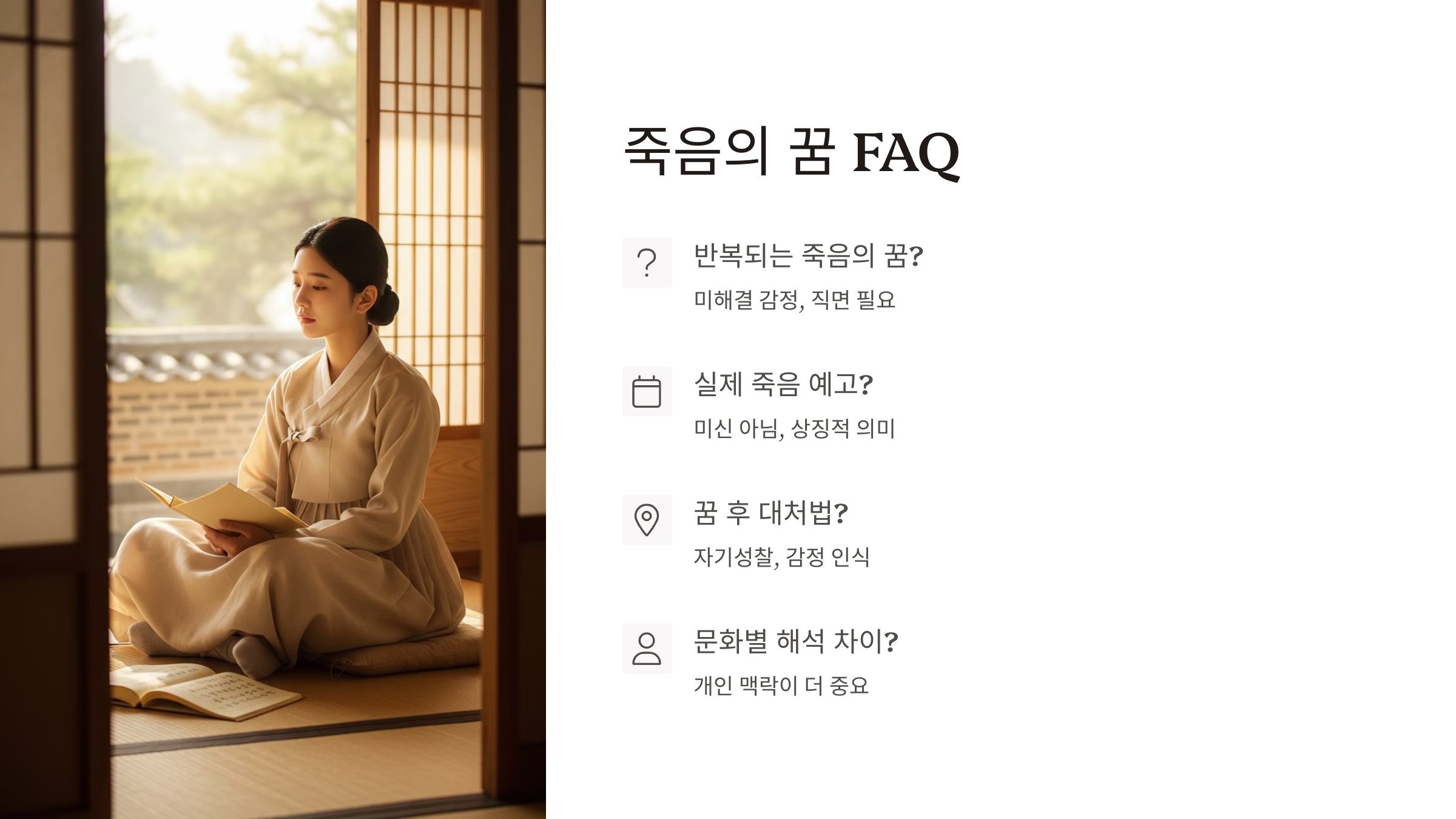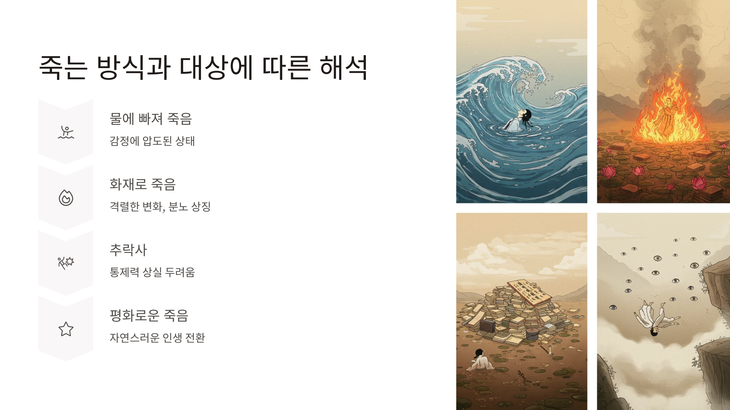 누가 죽었는지, 어떻게 죽었는지, 그 상황에서 내가 어떤 감정을 느꼈는지가 해몽의 핵심이에요. 특히 본인이 죽는 꿈은 아주 강력한 전환의 신호일 수 있어요. 삶의 한 챕터가 끝나고 새로운 이야기가 시작된다는 뜻이죠.