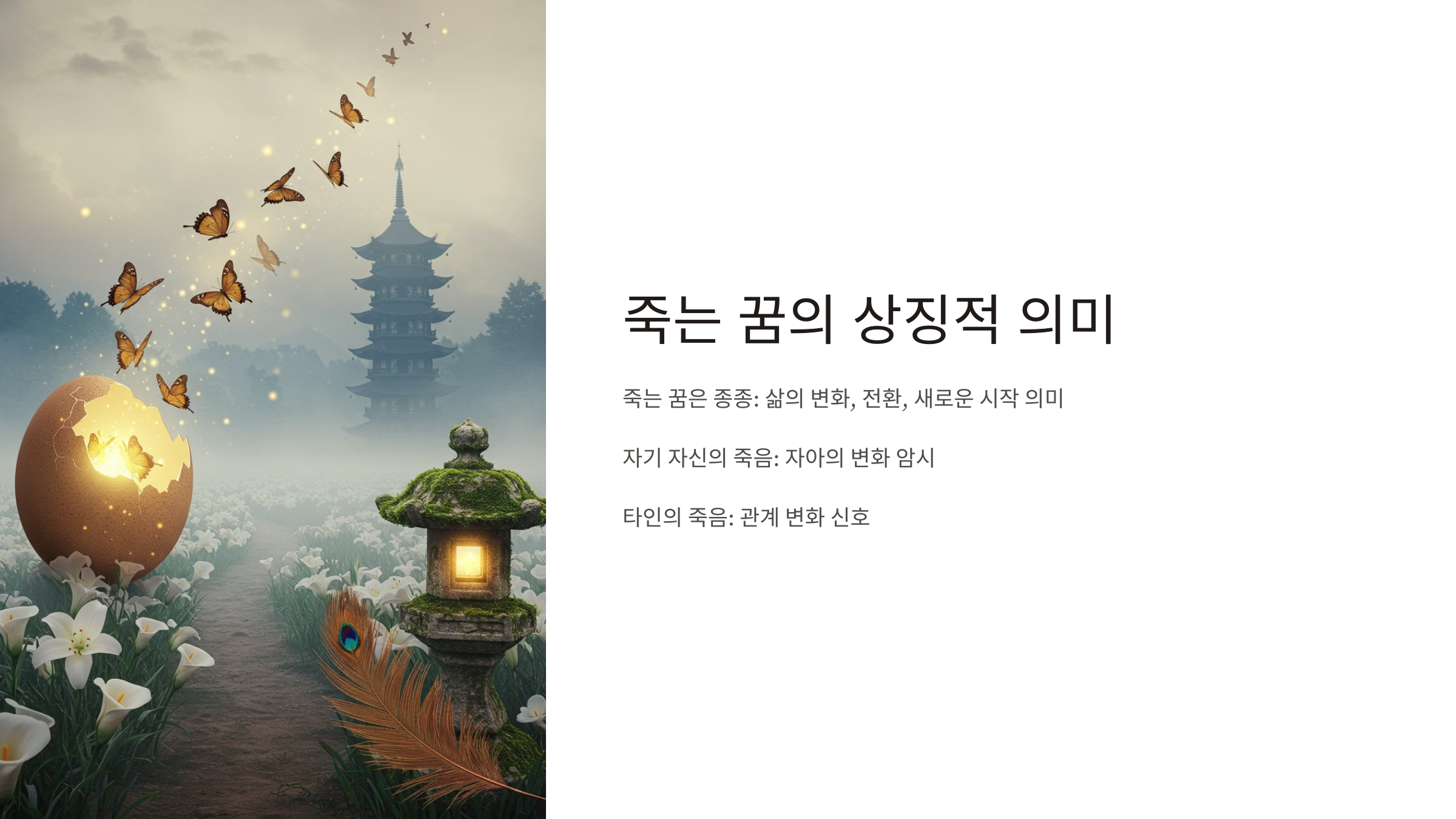 죽음은 끝이 아니라 변형이에요. 꿈은 나를 더 나답게 만들기 위해, 이전의 나를 놓으라고 말하고 있어요. 🌱