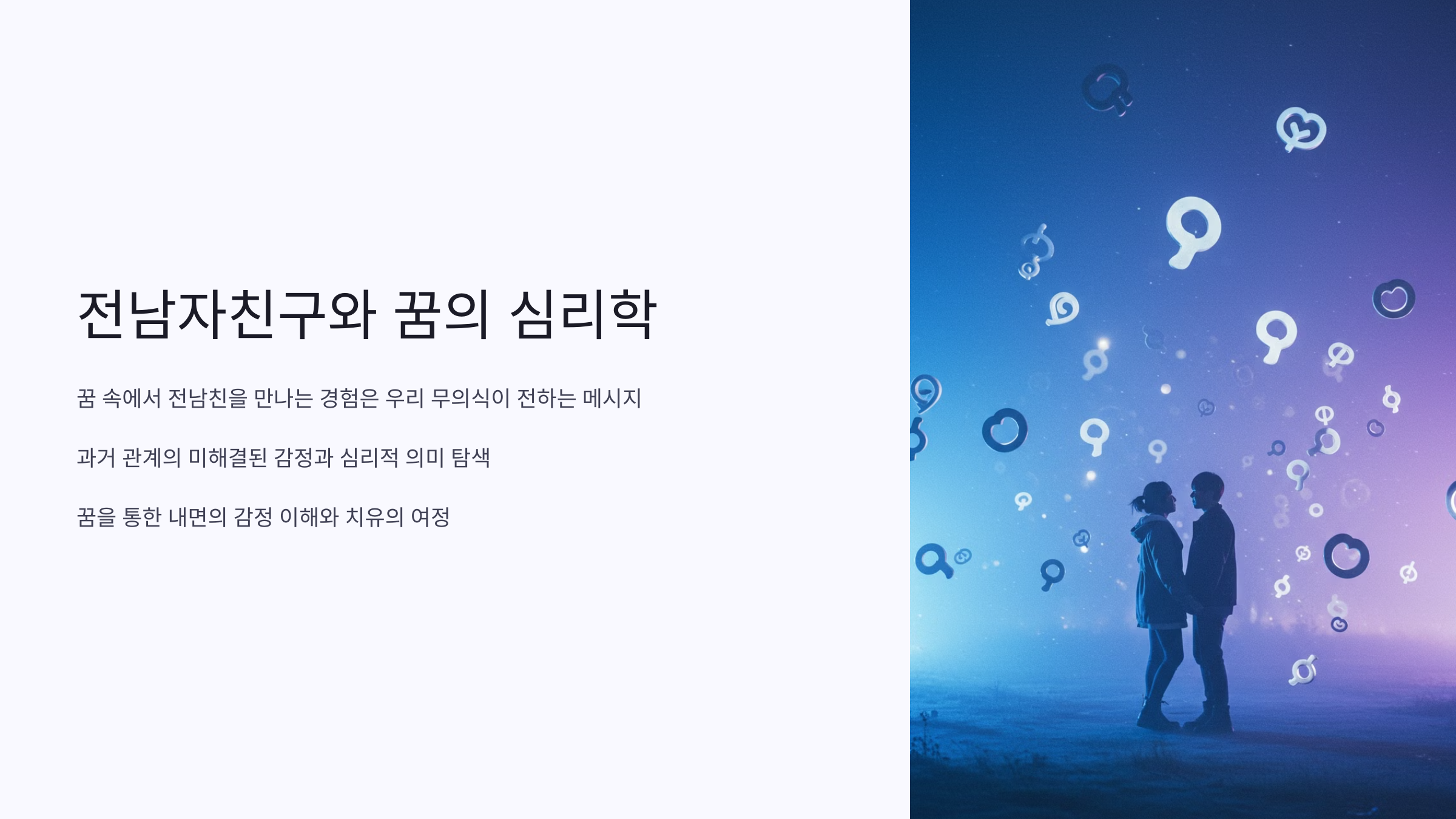 꿈속 전남친은 실제 인물보다 ‘감정의 상징’이에요. 외로움, 설렘, 상처, 죄책감 등 내가 마음속 깊이 묻어둔 감정이 다시 떠올라 무의식에서 장면으로 재생되는 거죠.