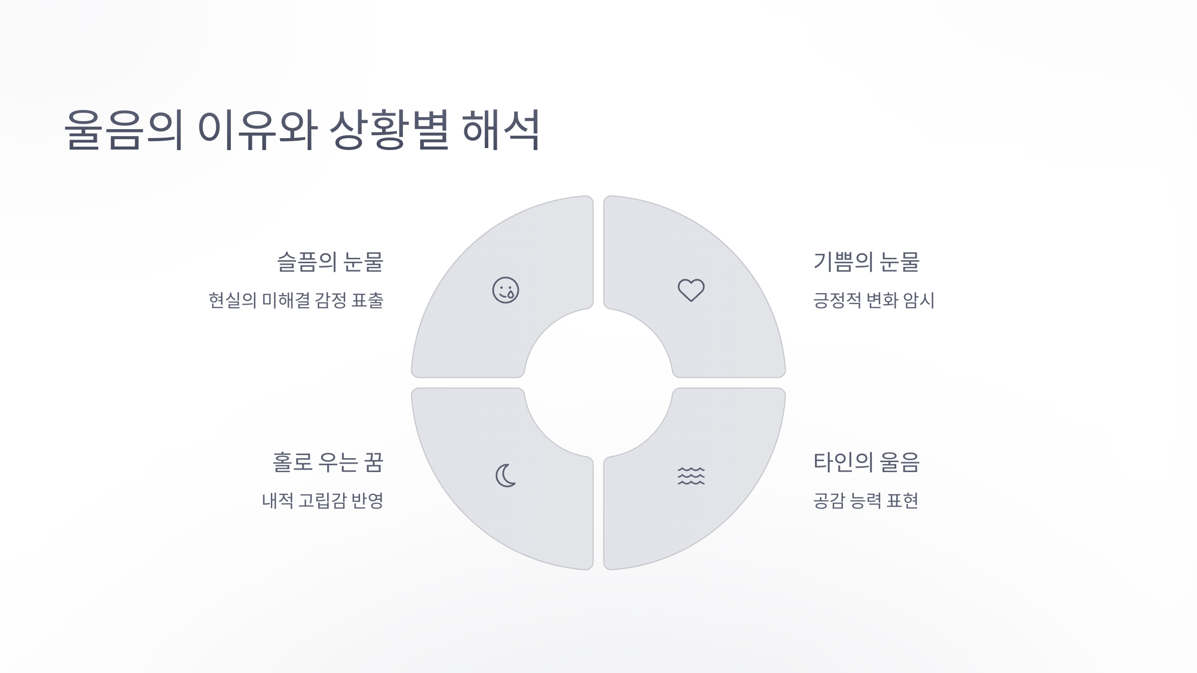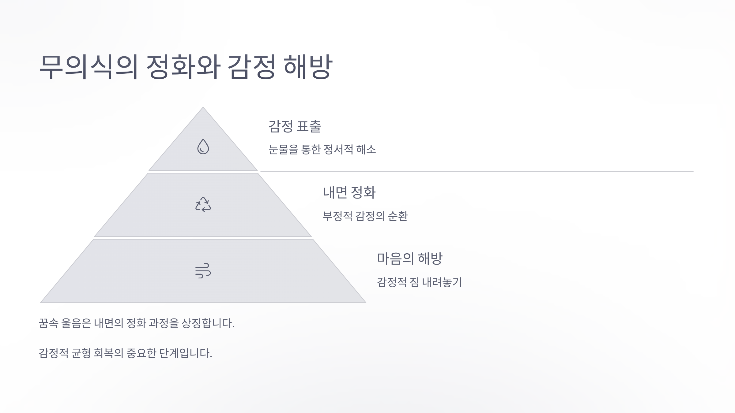 울음은 무의식이 감정을 대신 정리해주는 과정이에요. 꿈에서 우는 건 감정을 겉으로 드러내기 어려운 사람들에게 나타나기 쉬워요. 감정이 쌓이고 쌓여 더 이상 무시할 수 없을 때, 무의식은 이렇게 울음으로 반응해요.