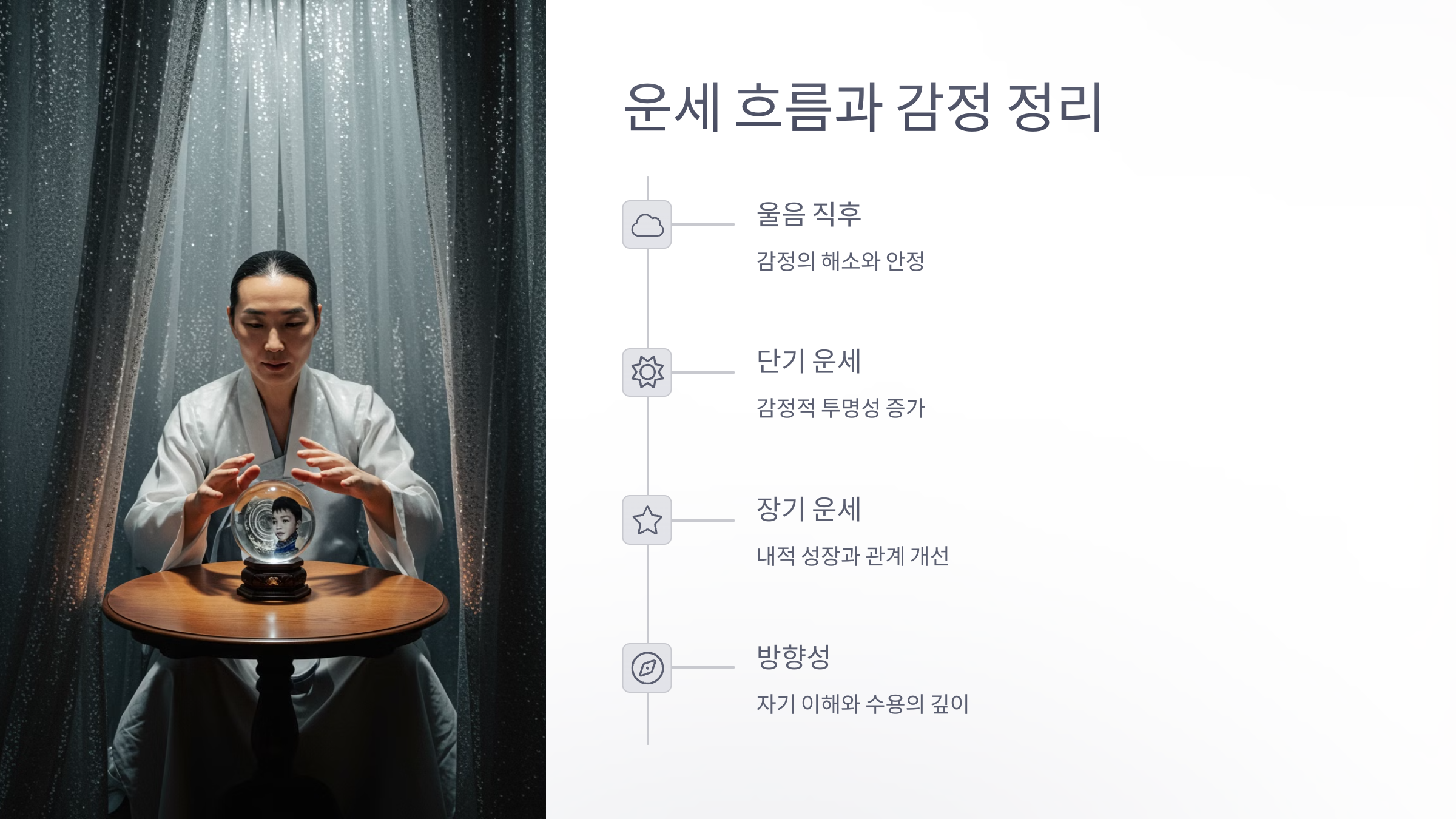 울고 난 후에 속이 후련한 느낌이 있었다면, 지금 감정 정리가 잘 되고 있는 상태예요. 반대로 울고도 찝찝하거나 답답했다면 아직 정리가 필요한 감정이 있다는 신호예요.