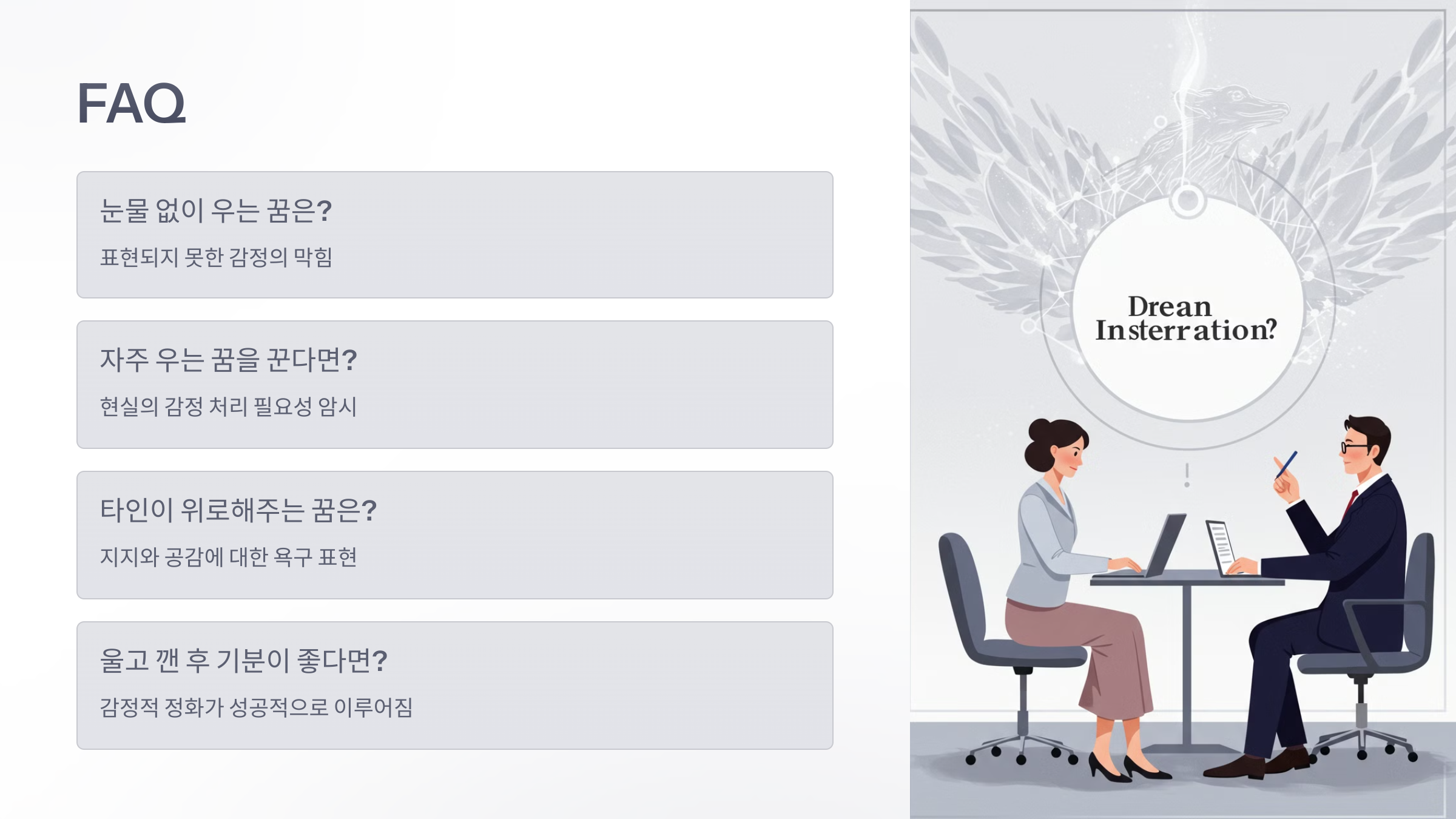 꿈속 눈물은 자기 연민이 아니라 자기 수용이에요. ‘이제 나도 내 감정을 이해하겠다’는 마음이 만들어낸 상징이에요.