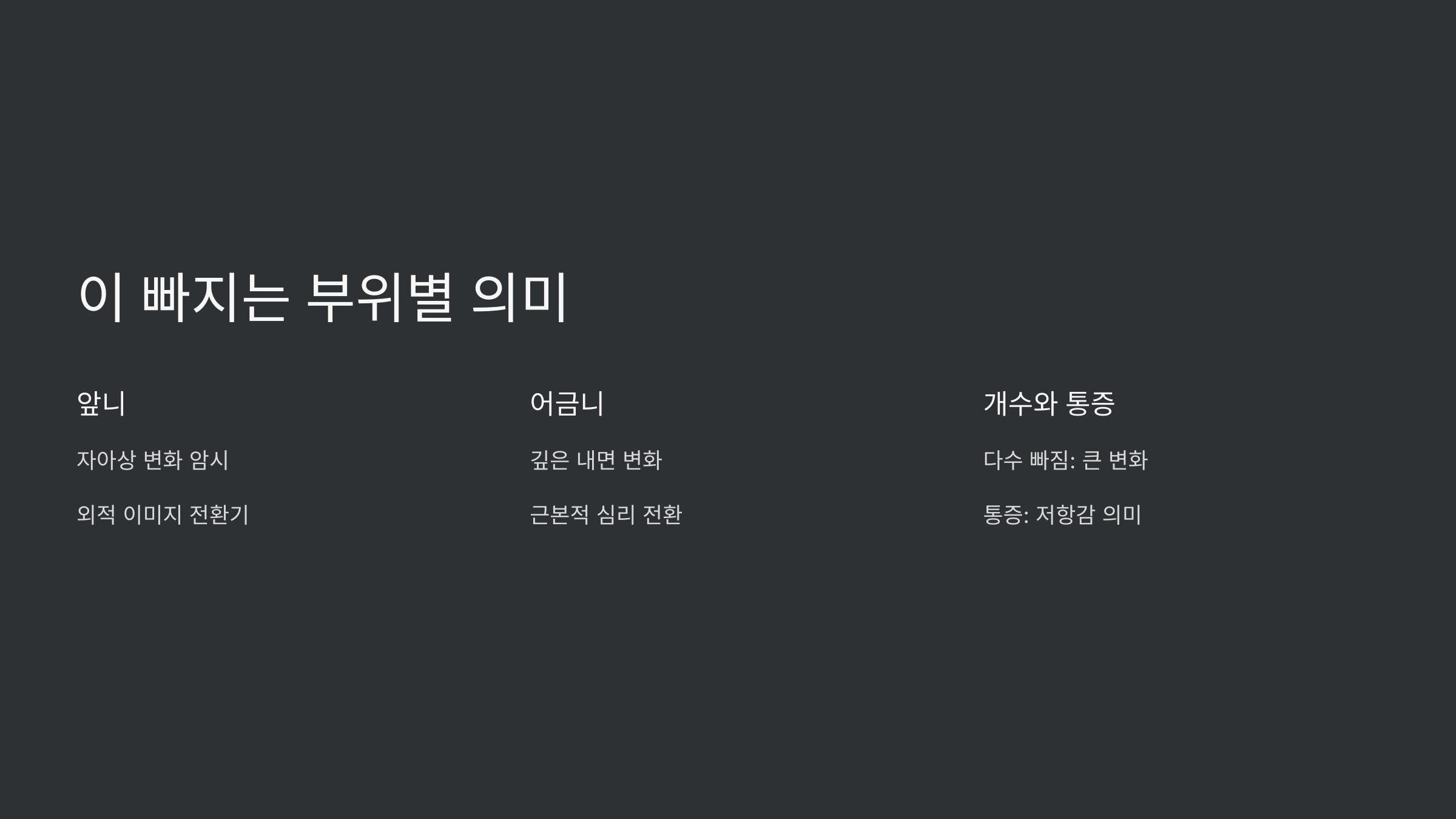 | 어금니 | 내면, 책임감 | 생활적 기반 흔들림 |