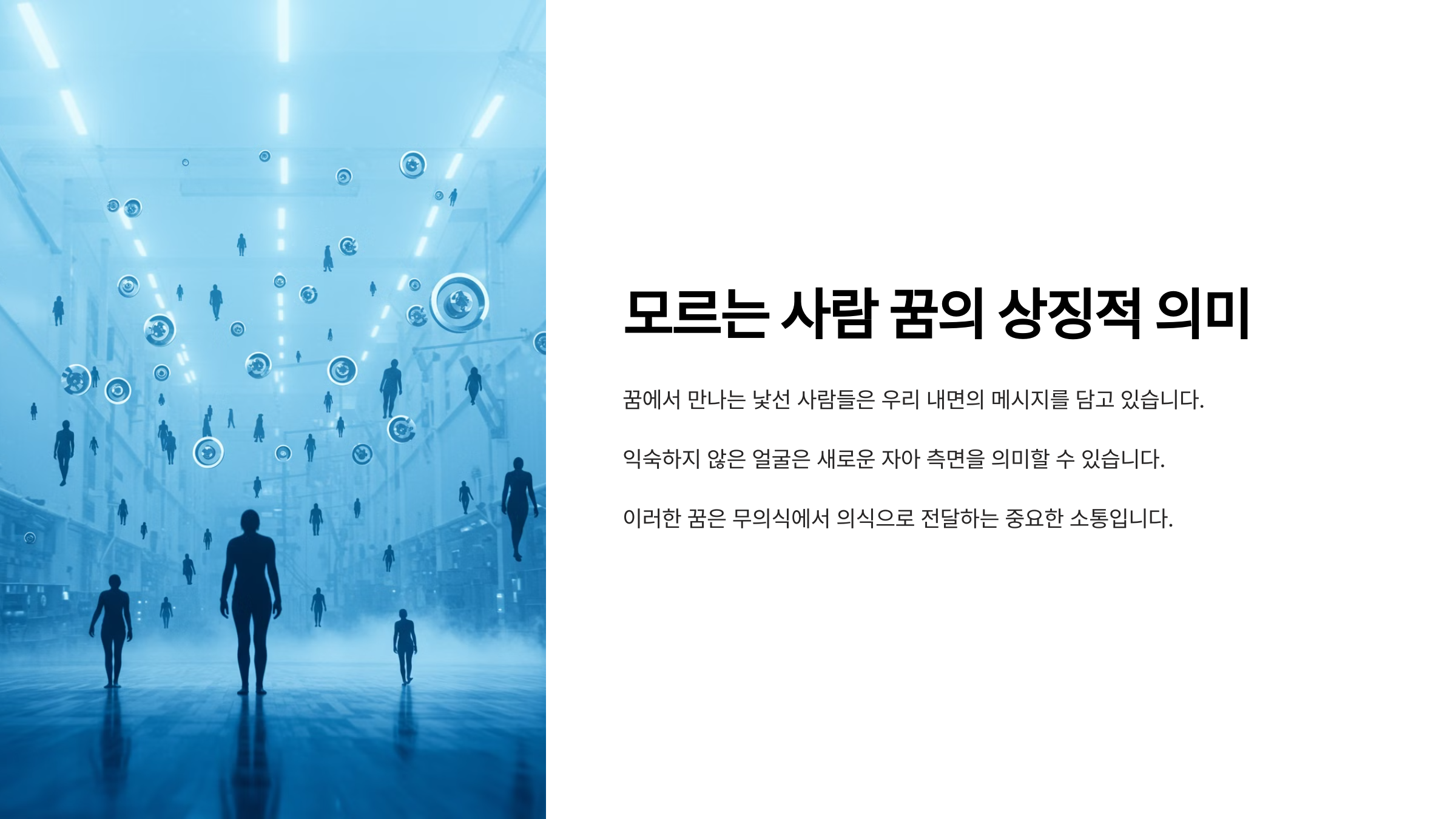 꿈속 낯선 인물은 내 안의 감춰진 자아일 수도 있고, 미래에 만날 사람일 수도 있어요. 메시지를 곱씹어보는 게 좋아요.