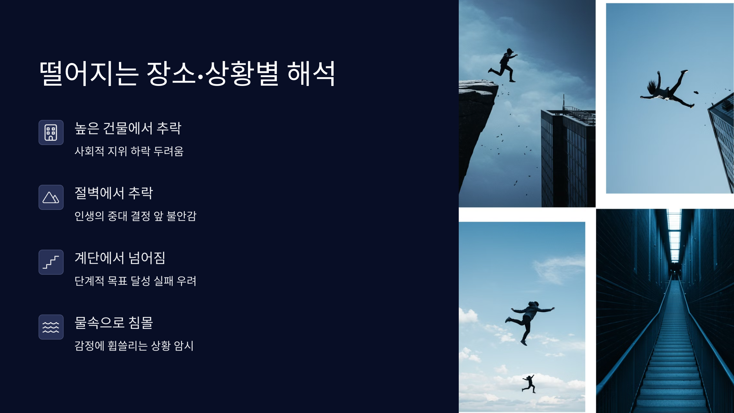 그럼 지금부터 떨어지는 장소, 감정, 상황에 따라 어떤 해석이 담겨 있는지 하나씩 살펴볼게요. 🪂💭